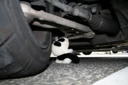 車のボディ下を覗いてみると、タイヤを支えるための部品がにょきにょき出ているんです。